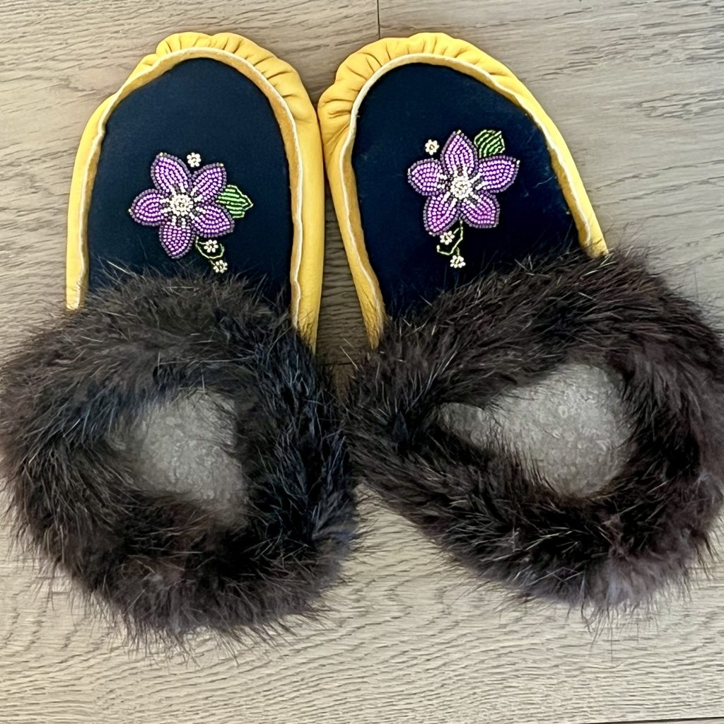 Having Métis status, I began learning traditional Métis arts/crafts in 2021. I made my first pair of Mukluks at a class taught by elder Joyce Beaver, in St. Albert, Alberta. I now teach beading, moccasin and mitt making classes in B.C.